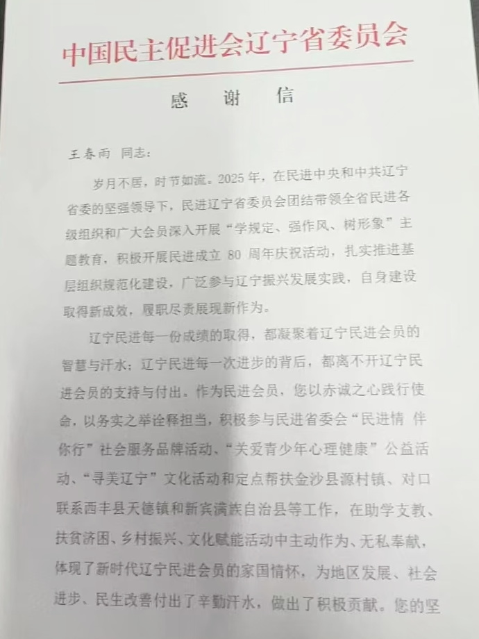 近日,民进辽宁省委会向浑南民进会员王春雨致感谢信,对其在2025年度“民进情 伴你行”社会服务品牌活动、“关爱青少年心理健康”公益活动、“寻美辽宁”文化活动和定点帮扶、乡村振兴等工作中主动担当、积极作为的突出表现,致以崇高的敬意和诚挚的感谢。信中高度肯定其以实际行动践行民进会员初心使命,展现了新时代浑南民进会员的家国情怀与责任担当。