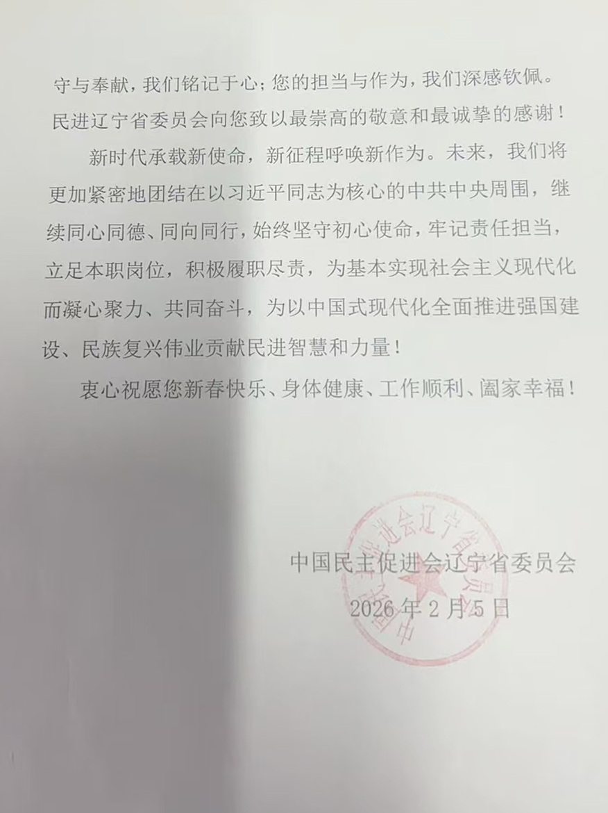 王春雨表示,感谢信既是荣誉更是鞭策,成绩的取得离不开组织的指导与培养。未来,他将坚守合作初心,勇担时代使命,以更昂扬的斗志投身民进事业与辽宁振兴发展实践,为谱写中国式现代化辽宁新篇章贡献民进的智慧与力量。